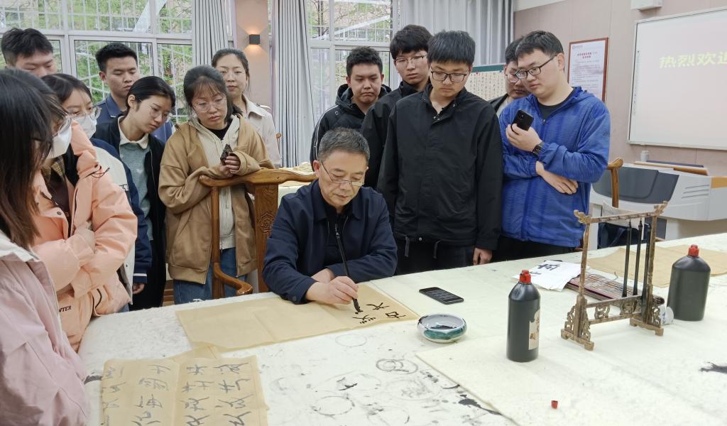 讲座交流过程中,苏光武老师将理论与实践相结合,首先基于理论的角度阐释了书写的基本知识,通过观察同学们书写时的状态、动作与方法等,提出了书法学习、选帖与练习等方面的具体建议;其次针对学生的现场作品进行了书写的技巧指导,通过亲身示范,为大家演示了隶书、行书等书体在书写时应注意的手法与笔法;最后结合实践认真回答了同学们的问题与困惑,并就师范生职业规范与教师专业能力发展对同学们书写训练提出了指导性意见。整个讲座交流过程,氛围和谐浓厚,同学们纷纷表示受益匪浅、获益良多。