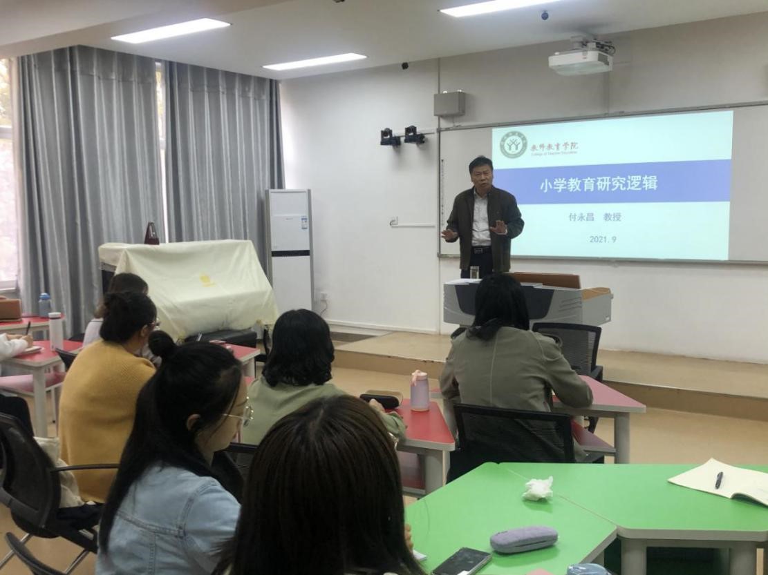10月7日下午,教师教育学院院长付永昌教授在教七楼402为小学教育专业2021级硕士研究生作题为“小学教育研究逻辑”的学术报告,学院研究生秘书常燕燕老师和全体2021级硕士研究生参加报告会。