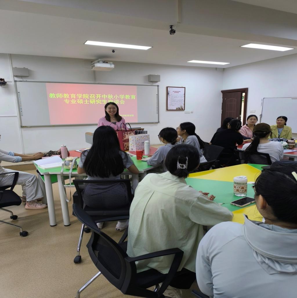 中秋佳节,举国欢庆,为有效增强研究生新生同学的归属感和凝聚力,帮助新生同学更快更好地融入新的学习和生活环境,9月14日下午,教师教育学院在教七楼402举行了2024级研究生新生中秋座谈会。研究生秘书兼辅导员常燕燕老师主持座谈会,2023级、2024级全体研究生参加活动。