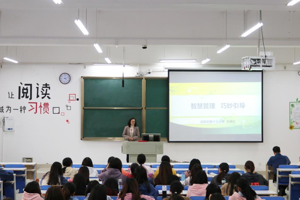 信阳市名班主任工作室主持人张雅红老师以“智慧管理、巧妙引导”为主题,开始指导2018级教育见习实践工作。