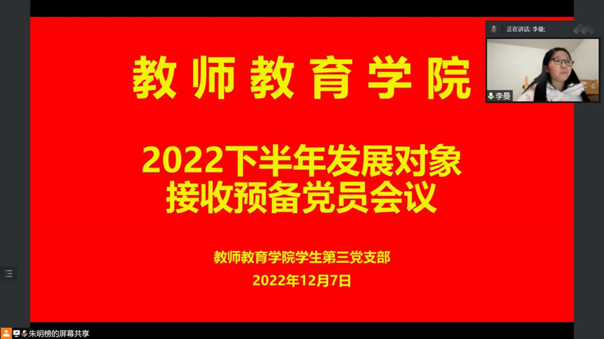 为进一步加强和推进学校基层党组织建设,发挥党组织的核心作用,为党支部注入新鲜血液,教师教育学院第三党支部于12月7日晚在腾讯会议召开2022下半年发展对象接收预备党员会议。本次会议由支部书记徐亚南老师主持召开,其中应到正式党员21名,实到21名。