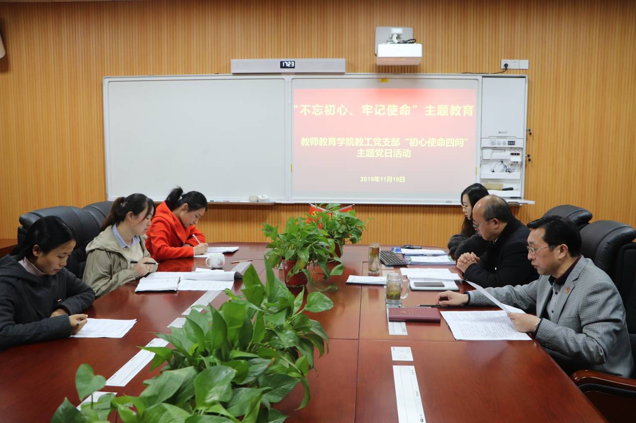 为推动“不忘初心,牢记使命”主题教育走深走实,根据省委主题教育领导小组办公室《关于在第二批“不忘初心、牢记使命”主题教育中开展党员“初心使命四问”主题党日活动的通知》文件精神,教师教育学院学生党支部、教工党支部分别于11月18日、19日在教七楼301会议室组织开展“初心使命四问”主题党日活动。
