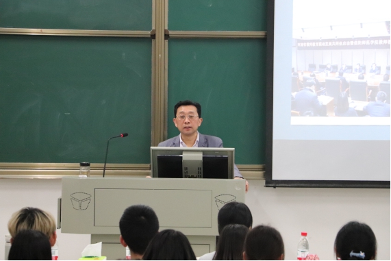 会议伊始,潘登从学校文化、学习教育、大学生活三方面为新生介绍学校发展情况,他以“厚德崇实,善学敏行”的校训为切入点,勉励学生紧跟时代要求,做到博学、勤学、善学。他结合学院的师资力量和办学条件,鼓励新生深入学习习近平总书记的重要讲话精神,扣好人生第一粒扣子,树立正确的思想价值观念,掌握专业知识,将科学理论转化为科学成果输出,成长为勇于担当的社会主义接班人。