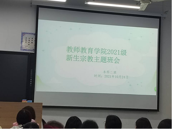 10月24日下午,教师教育学院在社科121教室开展以“崇尚科学,拒绝邪教”为主题的班会。2021级辅导员刘莅原和全体新生共同参加。会议由班长段锦程主持。