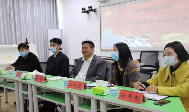 为深入贯彻习近平强军思想,响应国家鼓励大学生应征入伍政策,4月2日下午,教师教育学院特邀请我校人民武装部部长苏和、科长瞿巍莅临我院,出席毕业生征兵入伍动员大会。会议由学院党委副书记王艳蕊主持。我院人民武装专干姚雨承、毕业生辅导员徐亚南一同参加本次会议。