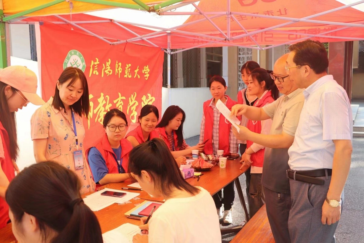 晨光熹微,2022级同学早早来到迎新点,积极热情投入迎新工作。同学们以饱满的热情和真诚的态度迎接前来报道的学生和家长,悉心回答他们的问题,引导新生完成身份核验、登记信息、领取校园卡等,帮助他们搬运行李,顺利完成入住。常老师有条不紊地收取新生材料、核实身份信息,为新生耐心解答并解决相关问题。教师教育学院党委书记潘登与副院长李文田到学院迎新点检查指导,传达学校学院对迎新师生与新同学的关怀。