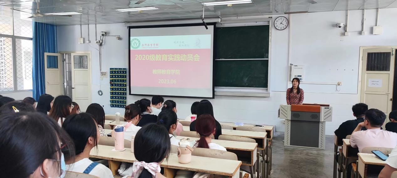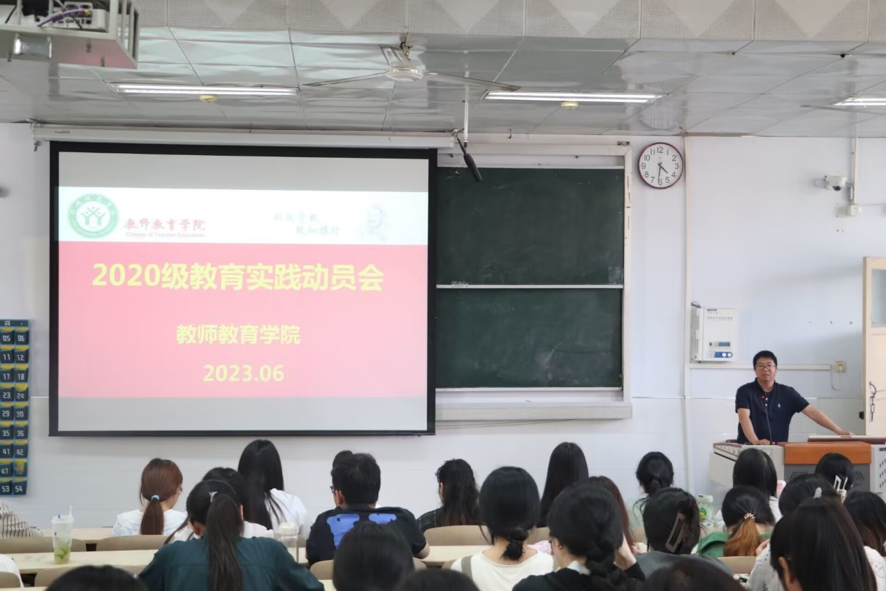 6月6日下午,教师教育学院于教六楼101教室召开2020级教育实践动员会,教师教育学院党委副书记王艳蕊、实践教学中心主任张祥耀、辅导员李依、班主任王召召、马茵茵和2020级小学教育专业全体学生参加了动员会,会议由张祥耀主持。