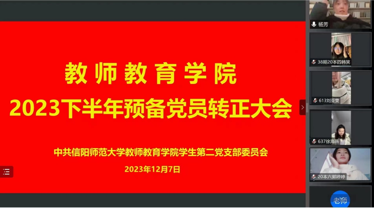 12月7日,教师教育学院通过腾讯会议成功举办2023年下半年预备党员转正暨接收预备党员大会。会议由杨芳担任主持人。学生第二党支部书记姚雨承、辅导员李依,第38期预备党员、第40期党员发展对象和学生第二党支部其他党员参加此次会议。
