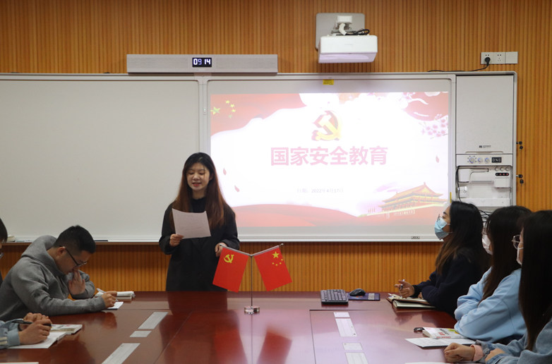活动伊始,胡梦成首先介绍了此次活动的背景,并结合做好国家安全工作所具有深刻的现实意义和历史意义,引导在场学生进行思考。接着,十位党员发展对象依次上台进行感悟分享。连丽洁以“国家安全知识知多少”为主题,向同学们科普了国家安全日的由来、国家安全的定义和内容等。并通过案例展示与分析,解构了危害国家安全的行为类型,号召同学们提高判断能力,切勿危害国家安全。余慧兰结合我国可持续发展的基本国情,从生态安全的概念、内容、面临的生态问题及如何维护生态安全四个方面,提出了生态安全对于国家安全的重大意义,鼓励同学们为更好的明天贡献自己的一份力。李帅以学院专业特点入手,号召同学们牢固树立国家安全观,走上社会岗位也要在其位,谋其职,负其责,尽其事,引导在场学生做国家安全的坚定维护者。随后,全体党员发展对象共同观看了视频《敲响生物安全的警钟》并就视频中的生态失衡、生物入侵等问题进行了讨论,进一步理解了国家安全与我们日常的息息相关。最后组长高鸽作总结发言,她表示,作为新时代大学生及党员发展对象,我们要增强自身的责任感和义务感,保持忧患意识。