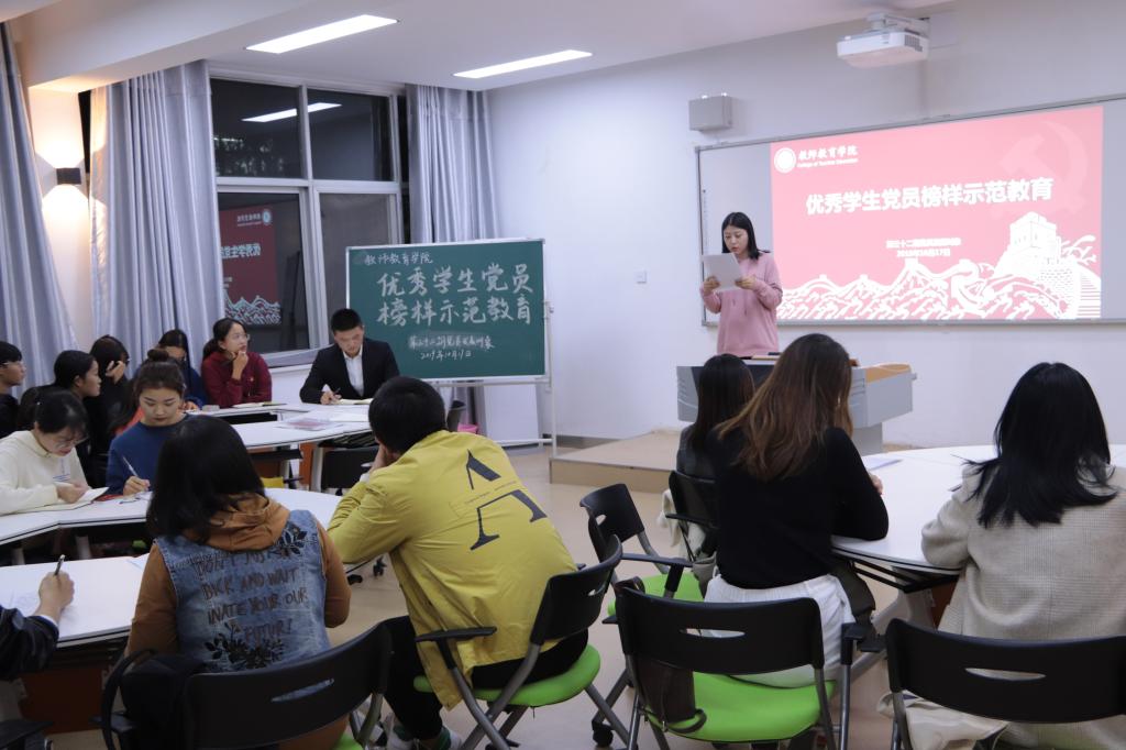 为贯彻落实“不忘初心、牢记使命”主题教育活动,加强学生党员的党性修养和服务意识,发挥其先锋模范带头作用,10月17日,教师教育学院学生党支部在教七楼402室举行“不忘初心、牢记使命”主题教育优秀学生党员榜样示范活动。学生党员代表张春胜、方晴、仇庭慧与十多名党员发展对象参加本次大会。会议由赵桂主持。