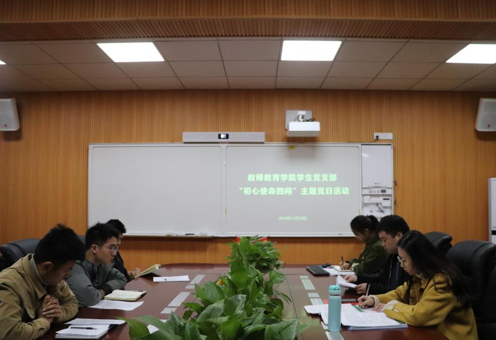 为推动“不忘初心,牢记使命”主题教育走深走实,根据省委主题教育领导小组办公室《关于在第二批“不忘初心、牢记使命”主题教育中开展党员“初心使命四问”主题党日活动的通知》文件精神,教师教育学院学生党支部、教工党支部分别于11月18日、19日在教七楼301会议室组织开展“初心使命四问”主题党日活动。