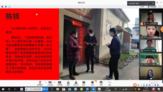 会议伊始,与会党员在仇庭慧的领誓下重温了入党誓词。接着,学生党员集中学习了疫情期间以钟南山院士和李兰娟院士为代表的感人事迹及伟大精神,与会成员纷纷表示,将会认真学习两位院士为国为民、无私贡献的高尚品质,树立正确的人生观、价值观。其中,18级专科一班入党积极分子防疫控疫先锋代表陈铎讲述了自己在疫情蔓延时期经过严格防护培训和考核,加入社区志愿者服务队的所做所感,他认为,在志愿者服务队为战役的初步胜利贡献一份青春力量是极其光荣的,学生党员应该不忘初心,牢记使命,发挥先锋模范带头作用。在“我想对党说句话”暖心时刻,全体党员都表达了对共产党生日的祝福和实现中华民族伟大复兴的美好祝愿。