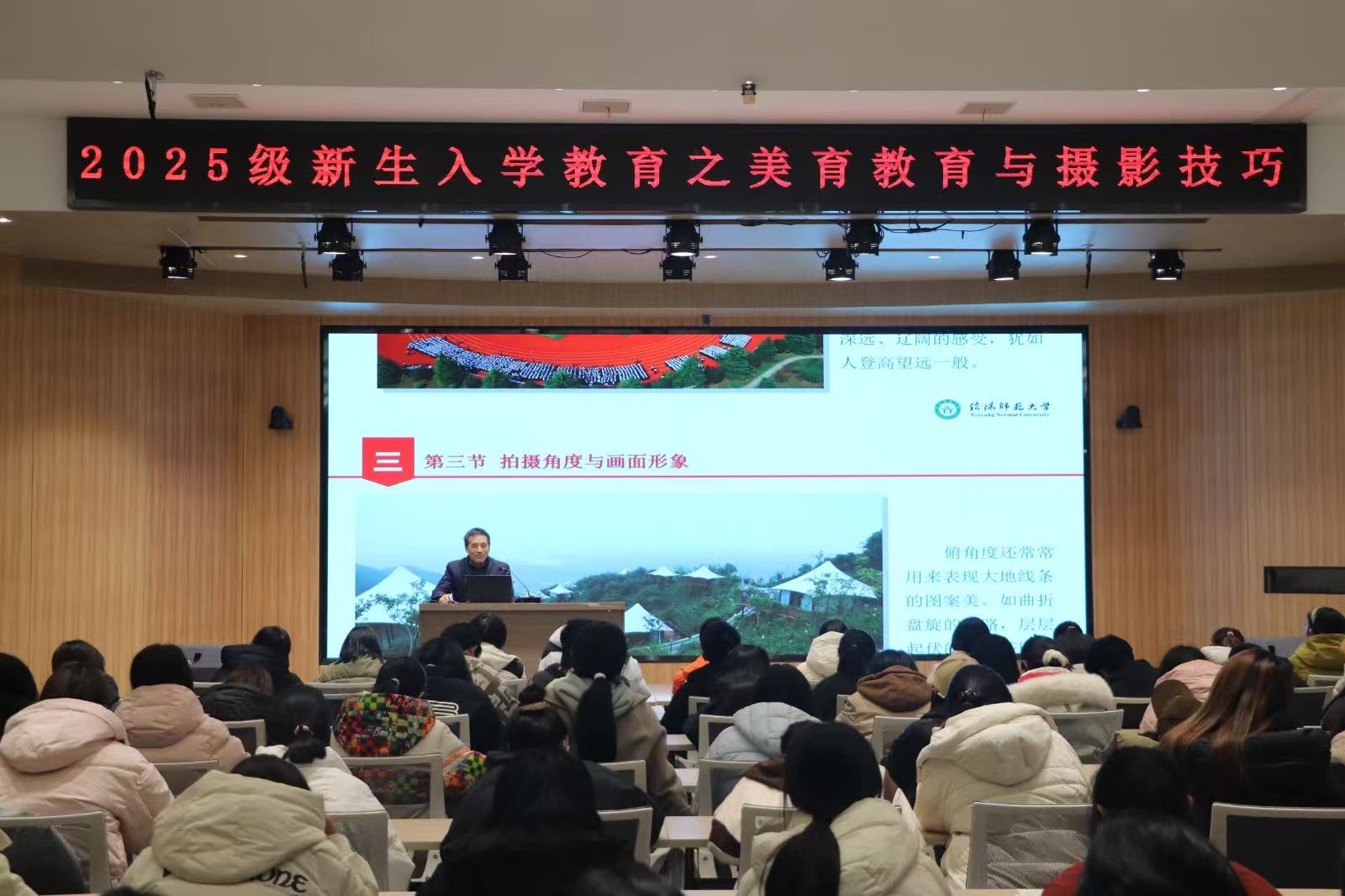 为丰富新生入学教育体系,提升学子审美素养与实践能力,引导其在发现美中涵养人文情怀,11月18日,教师教育学院于谭山书院博雅讲堂特邀请信阳师范大学关工委“金色银龄”宣讲团成员王存选老师为教师教育学院学生作“美育教育与摄影技巧”专题讲座。教师教育学院辅导员姚雨承、李珂及2025级新生参加讲座。