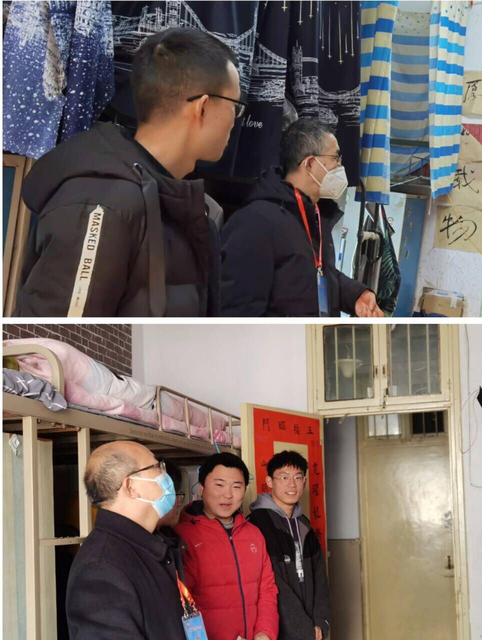 潘登首先查看了宿舍的各项设施,了解学生假期状态及新学期计划,对学生关心的问题耐心解答;叮嘱学生养成良好的生活习惯,尽快调整作息习惯;指导学生做好新学期学习、成长规划,以积极昂扬的状态投入到新学期的学习与生活中。付永昌亲切地和同学们交流,他叮嘱同学们新学期仍要严格按照疫情防控要求做好宿舍内务整理、通风消毒、一日三检等日常工作,同时鼓励学生在新学期能够不忘初心、坚持理想、努力学习、夯实基础,在不断挑战自我中成长。同学们备受鼓舞,对领导老师们的关切表示感谢,纷纷表示在新的一年继续奋斗,学好专业知识,不断提升自己。