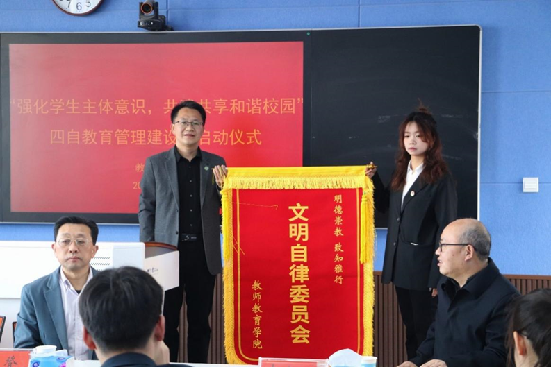 “四自”教育是将“自我教育、自我管理、自我服务、自我监督”融入学生教育、管理、服务和监督的全过程,让大学生由被动接受教育转为主动进行教育,既符合大学生思想政治教育的基本规律,也凸显了大学生思想政治教育的主体性和时代性。通过“四自”教育,希望同学们能够树立主人翁意识,争做学校的形象大使、美容师,成为正能量文化的传播者和践行者,为我校建设高水平师范大学营造良好氛围。
