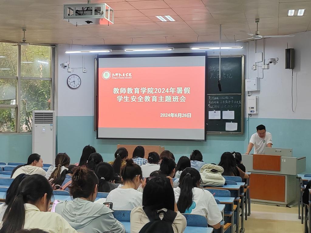 为了增强学生暑假安全意识,强调暑假出行注意事项,6月26日,教师教育学院于教九楼104教室开展了暑假安全教育主题班会。会议由姚雨承主持,全体在校学生参加。