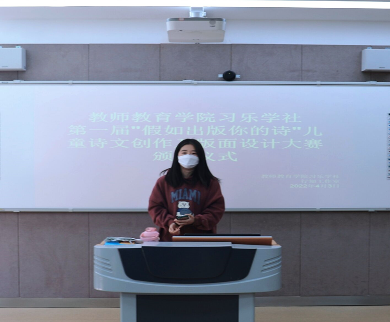 4月3日,教师教育学院“假如出版你的诗”儿童诗文创作及版面设计大赛颁奖仪式在教七楼201教室顺利举办。此次比赛采取线上征集作品的形式,全校共计500余人参与。我院教师张祥耀、谭阿明、王召召担任此次大赛评委。
